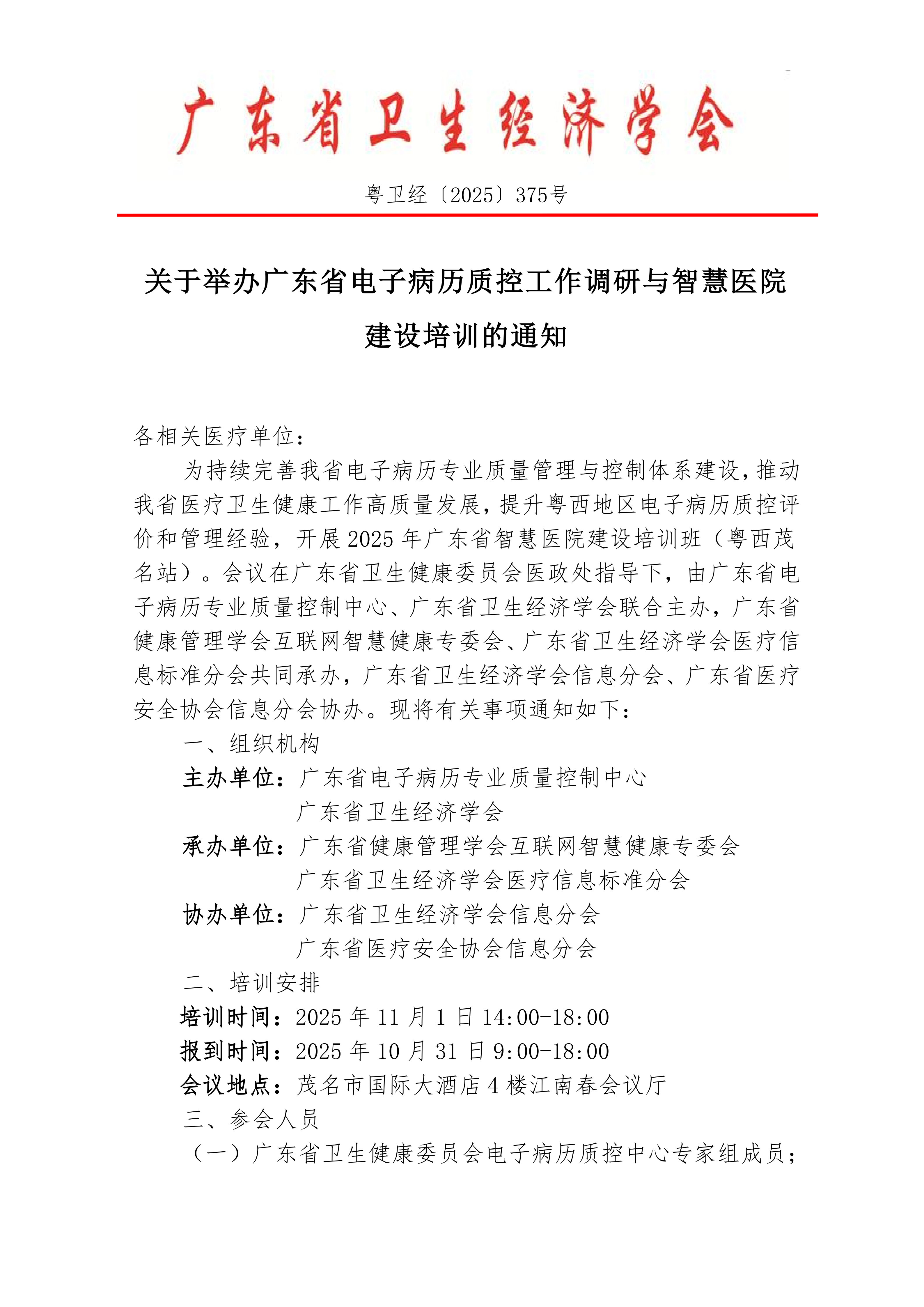 关于举办广东省电子病历质控工作调研与智慧医院建设培训的通知