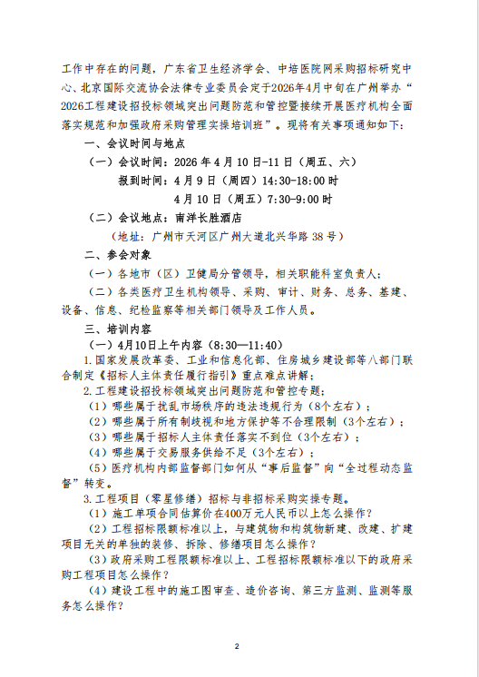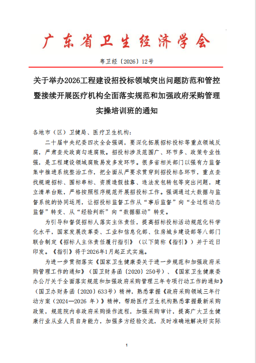 关于举办2026工程建设招投标领域突出问题防范和管控暨接续开展医疗机构全面落实规范和加强政府采购管理实操培训班的通知