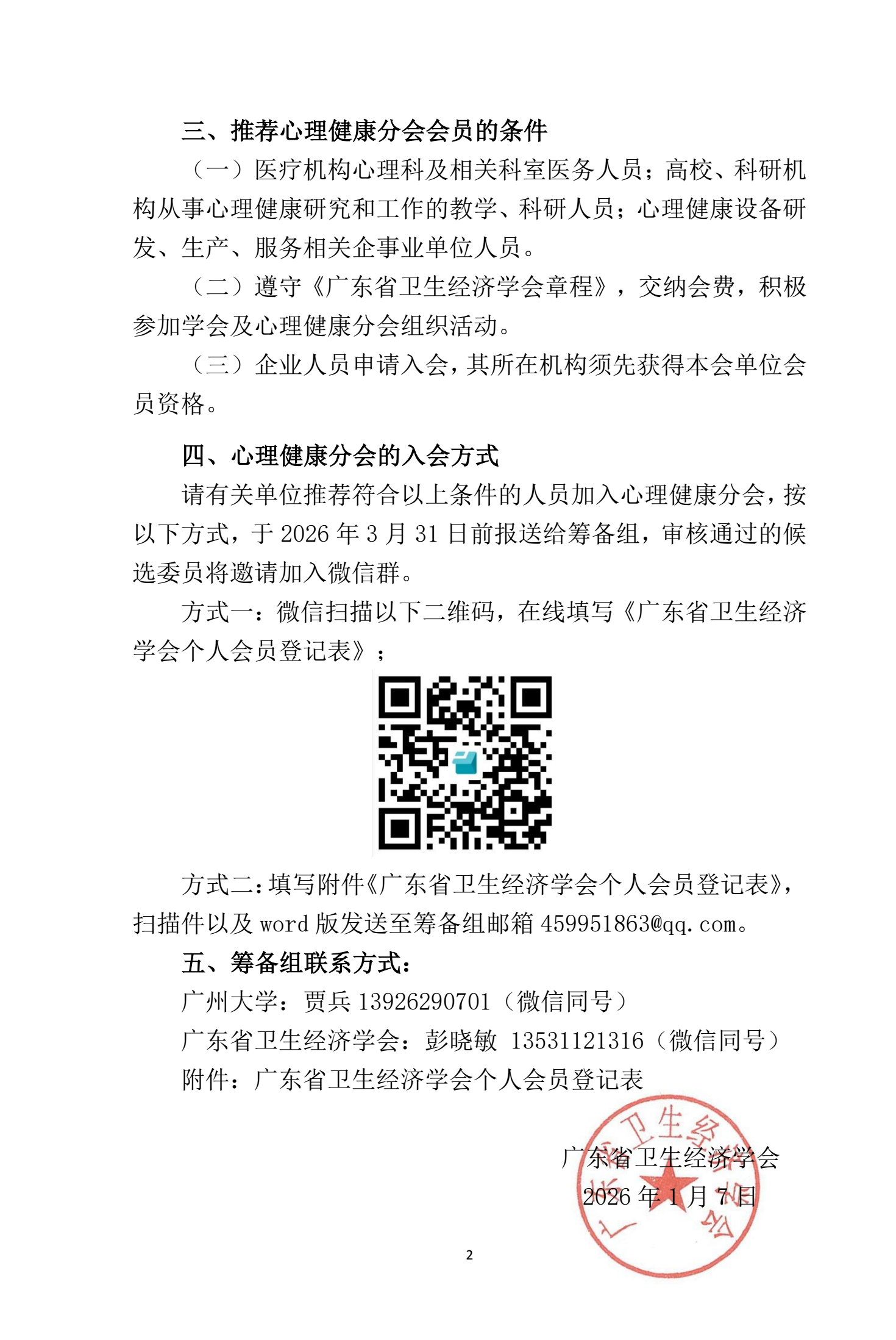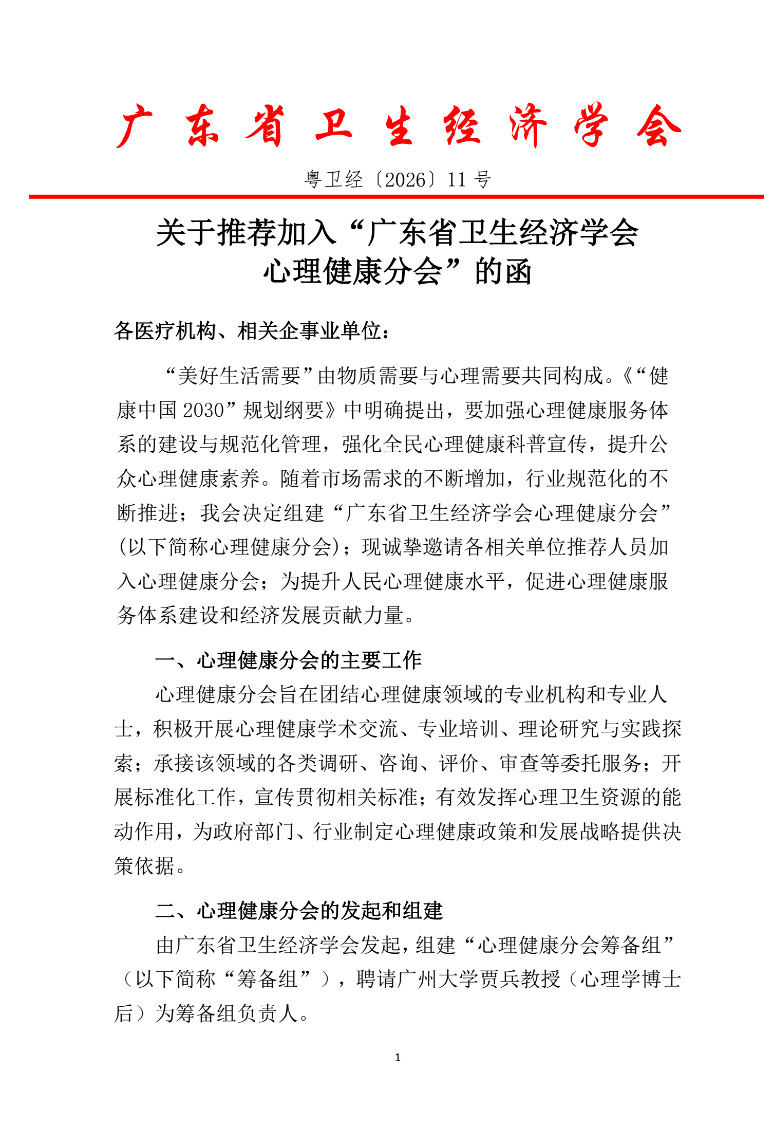 关于推荐加入广东省卫生经济学会心理健康分会的函